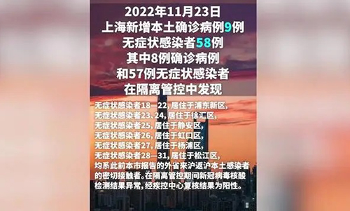 上海市卫健委今早(11月24日)通报:2022年11月23日0—24时,新增本土新冠肺炎确诊病例9例和无症状感染者58例,其中8例确诊病例和57例无症状感染者在隔离管控中发现。